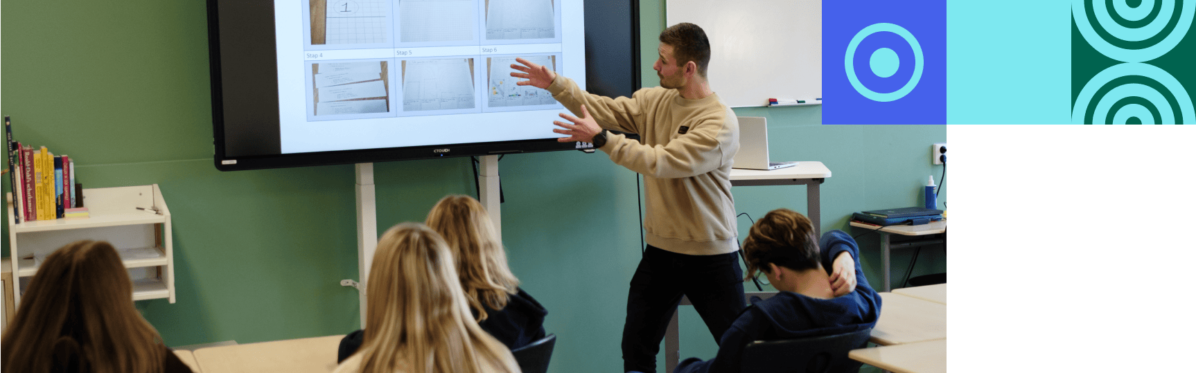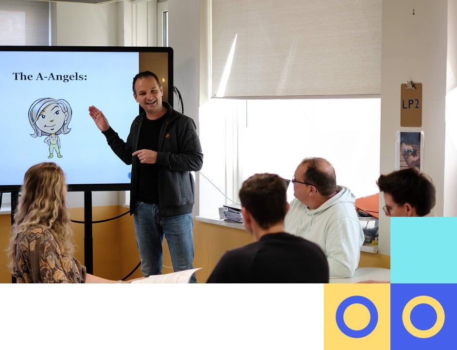 De trainer stapt de klas in. De leraar is aanwezig als observator en maakt aantekeningen. De groep gaat onder leiding van de trainer aan de slag.